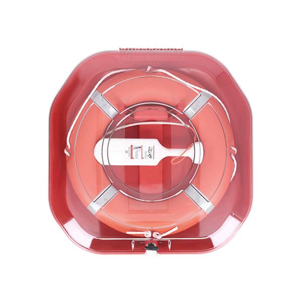 Deze reddingsboeikast is voorzien van een transparante deksel. De reddingsboeikast is gemakkelijk en snel te openen. Na het openen sluit de deksel vertraagd waardoor de handen vrij blijven om het reddigsmateriaal uit de kast te pakken. De reddingsboeikast is te sluiten met een knevelsluiting. De buitenkant van de deksel is voorzien van een instructiesticker met instructies hoe te handelen in een noodgeval.