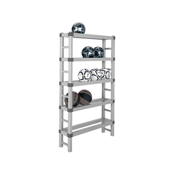 Het Rea kunststof ballenrek is ideaal voor het opbergen van ballen. De schappen zijn gemaakt van kunststof holle buizen en uitgevoerd met 4 horizontale vakken. De tussenruimte tussen de schappen bedraagt 30 cm. Op de bovenkant kunnen ook nog ballen worden neergelegd, waardoor je dus 5 schappen hebt. Schapruimte bedraagt 85x25x30 cm (LxDxH).
