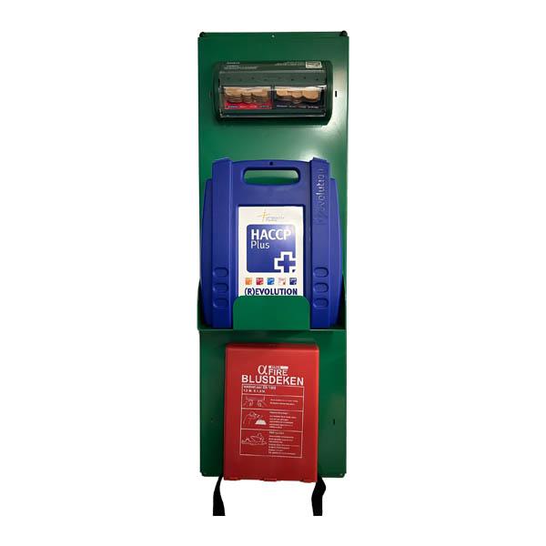 (R)evolution eerste hulp paneel voor BHV en eerste hulp in de voedselindustrie en horecagelegenheden. Dit paneel bestaat uit een basis verbandtrommel HACCP Plus, pleisterautomaat HACCP en blusdeken.